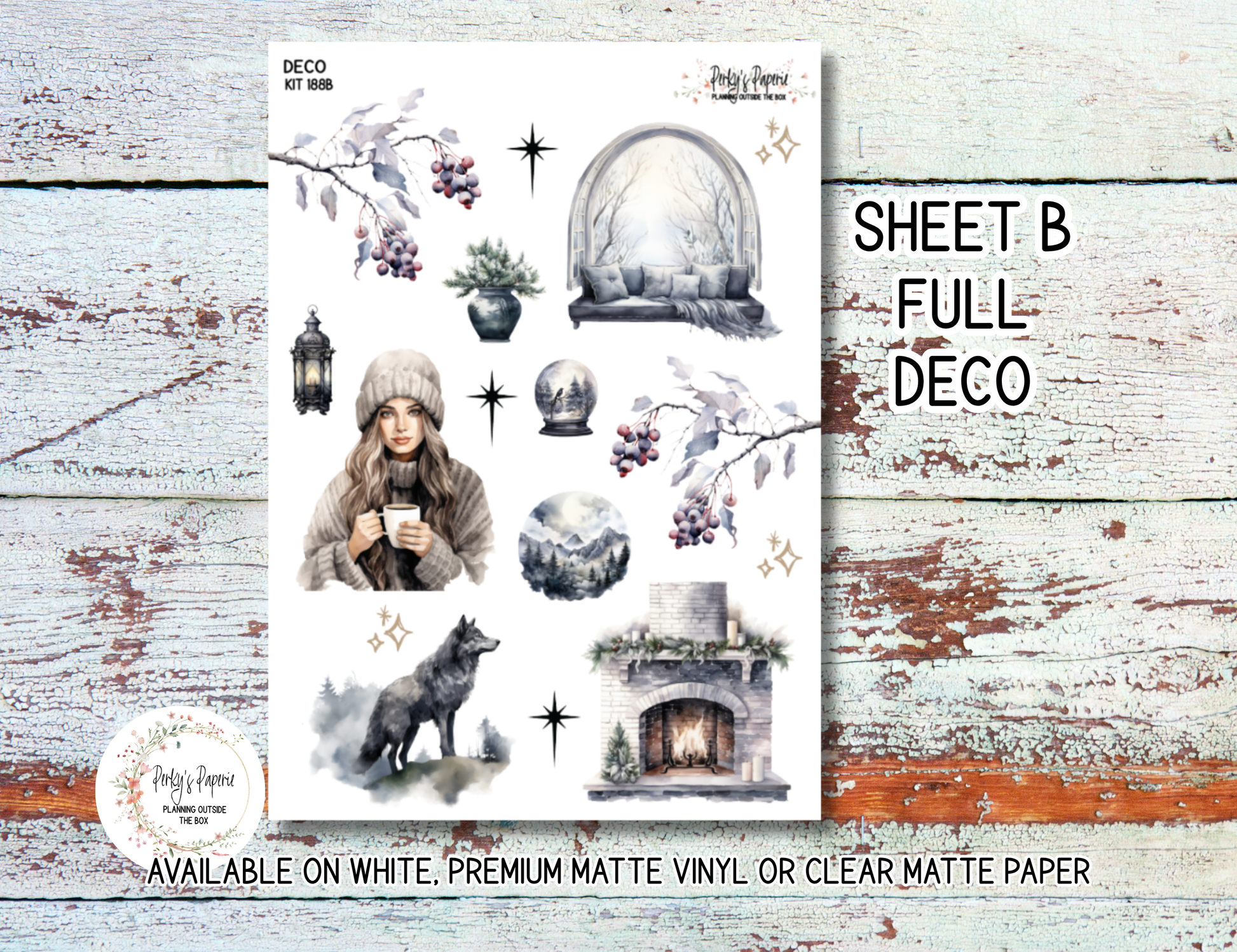 🌫️ 2 Deco Sticker Sheets – filled with moody winter elements like cozy scenes, books, mugs, and subtle neutral tones